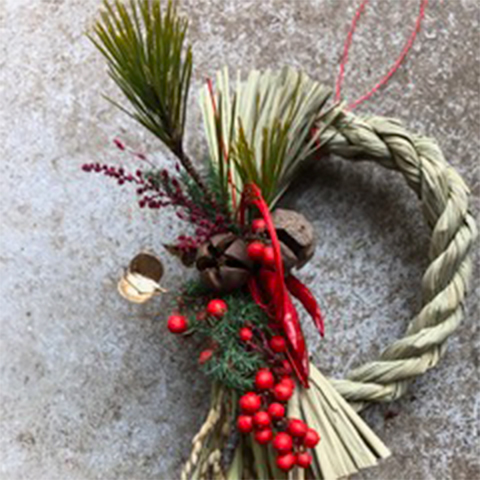 縄をくるっと丸めてお米や水引をつけて作るしめ飾り。