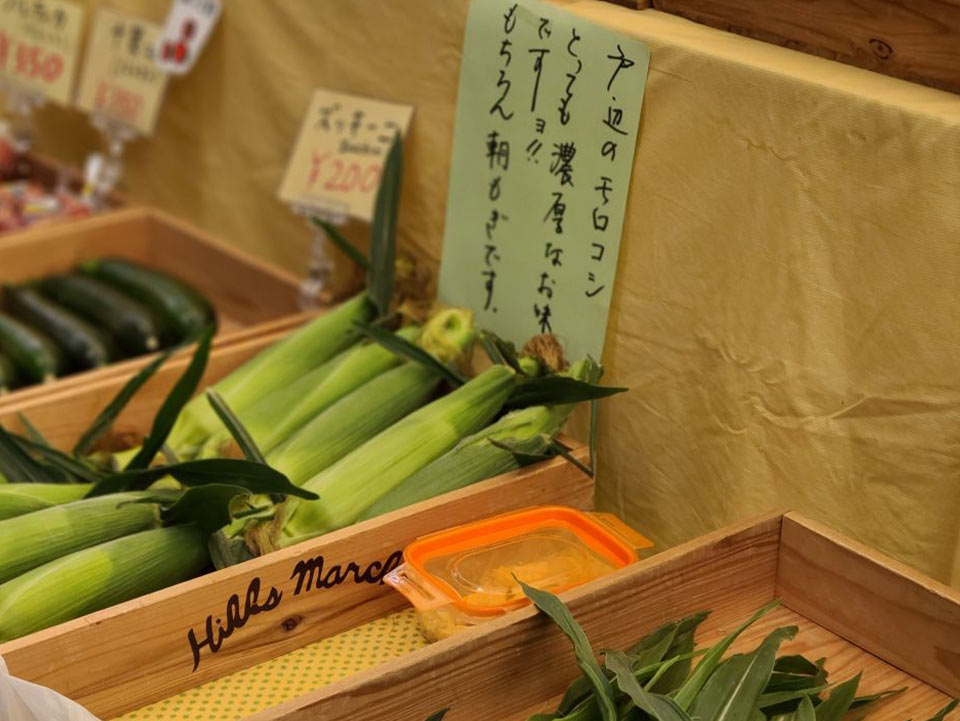 マルシェの老舗、リピーターさんとはツーカーの関係「戸辺農園」さんでは、いよいよトウモロコシが出始め、やっぱり幅広い層に人気のトウモロコシは目玉でもあり、続々と手に取られています。